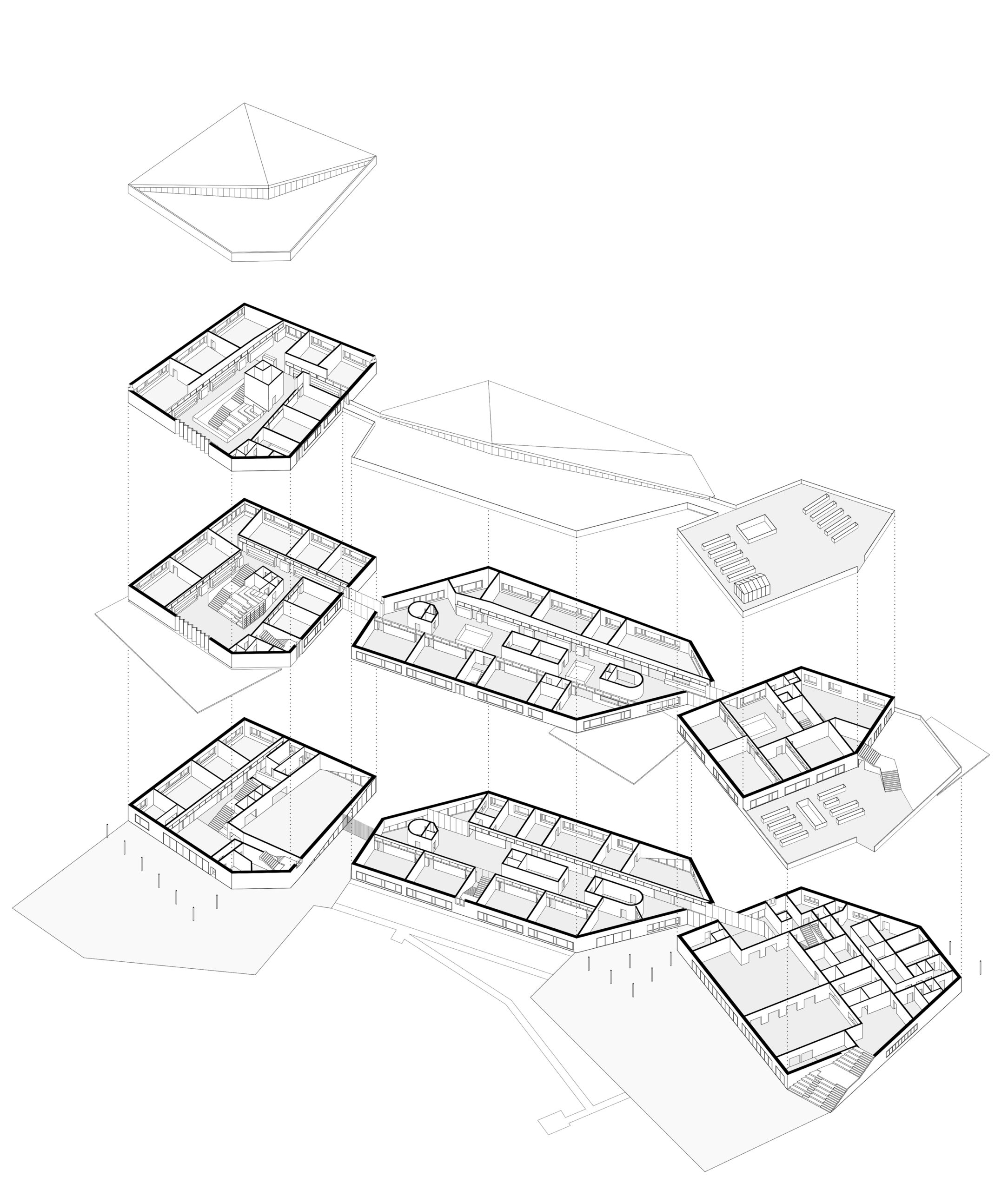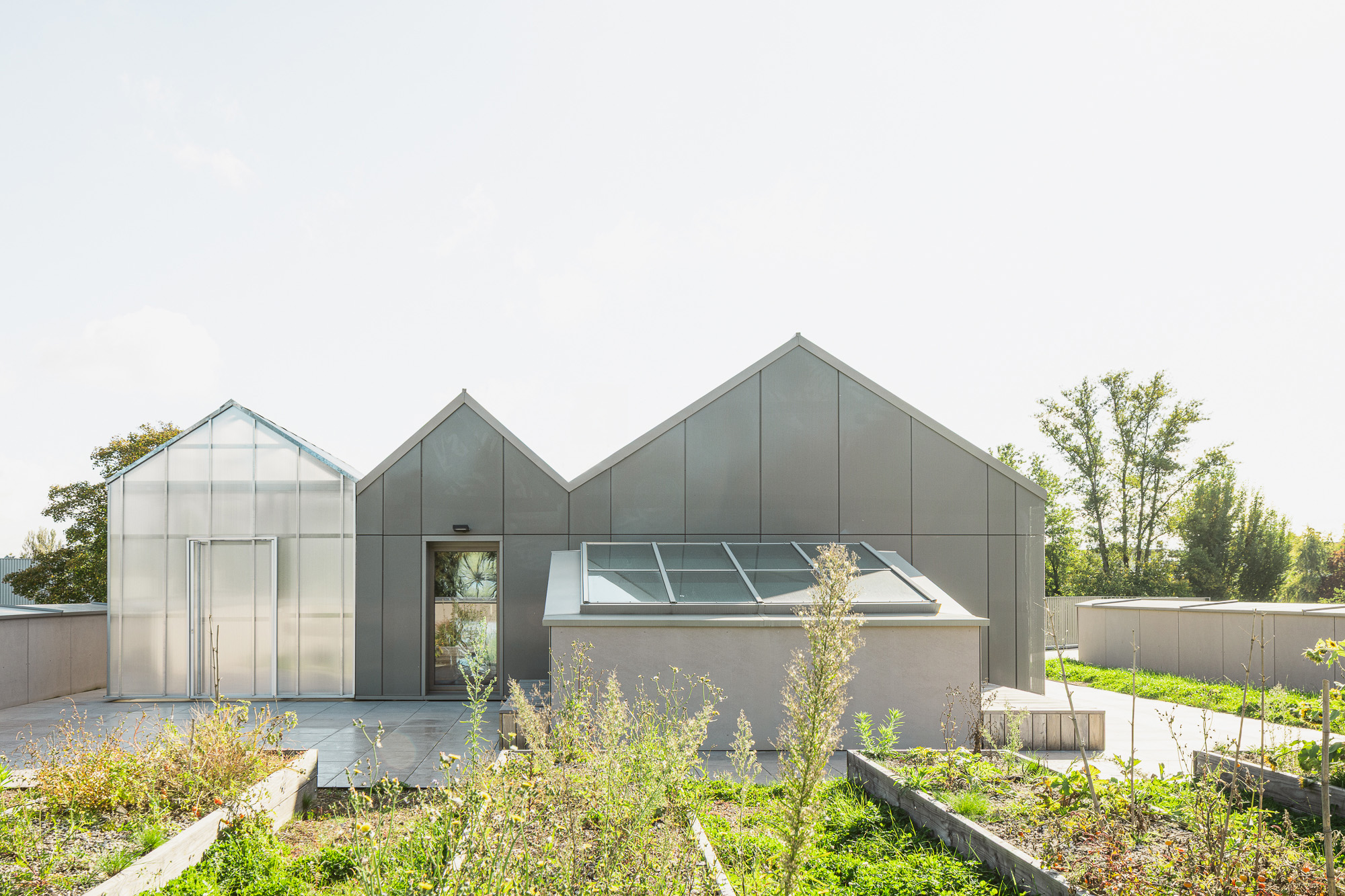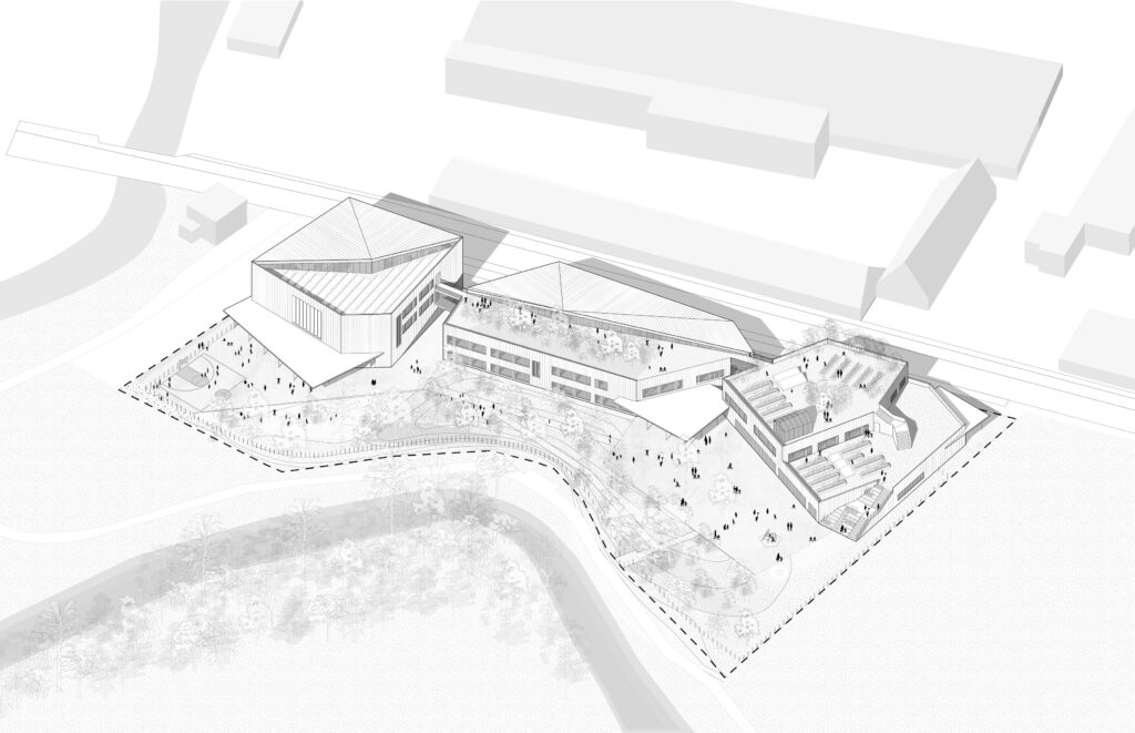 Fragmenté en trois volumes à taille humaine, le programme offre une forte connexion avec la nature environnante. Le sol occupé par le bâti est largement restitué en toiture. Accessible aux enfants, cette dernière accueille la production d’énergie solaire mais aussi des potagers, une serre, un poste d’observation de la nature et un petit bois.