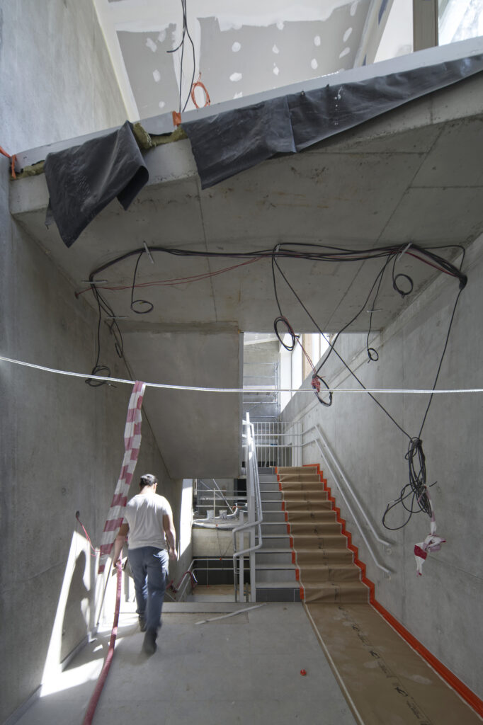 La structure, rendue lisible, devient un élément de la finition intérieure des espaces, et accompagne l’usage du bois en second œuvre. A la fois pour son bilan carbone favorable et pour le confort qu’il procure, le bois est mis en œuvre dans une grande diversité de formes et de finitions.