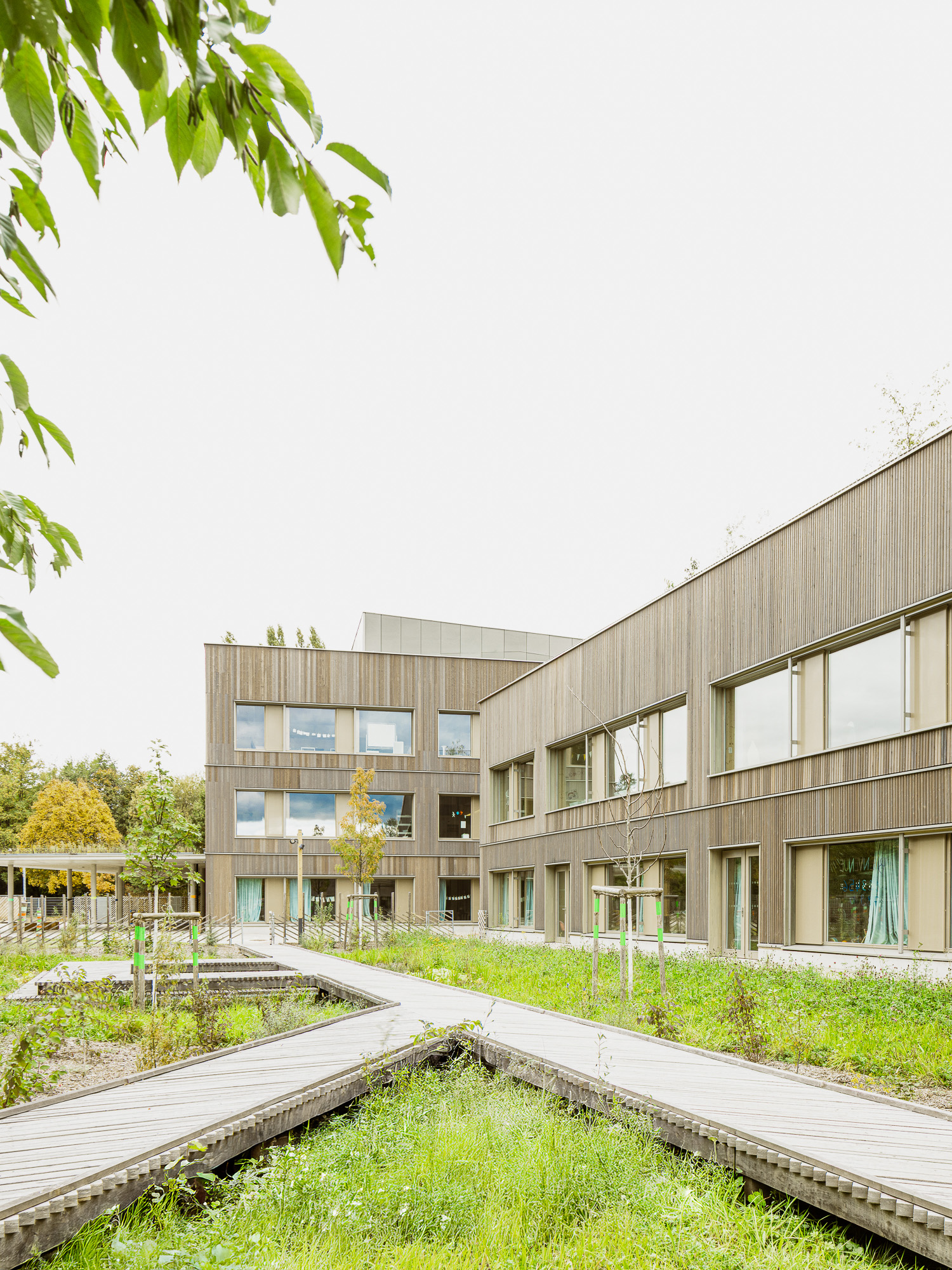 La gestion des eaux pluviales est mise en valeur pour servir de support pédagogique aux équipes enseignantes. Les cours de récréations, faiblement minéralisées, offrent un cocon vert aux enfants où chacun peut observer, explorer, expérimenter et jouer.