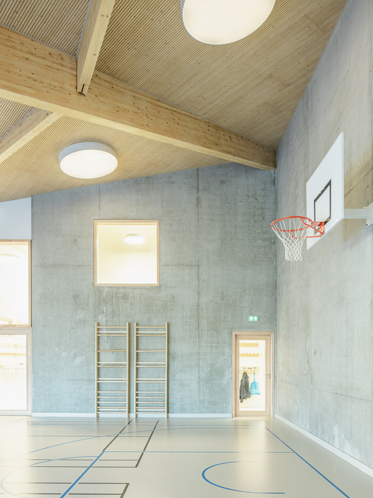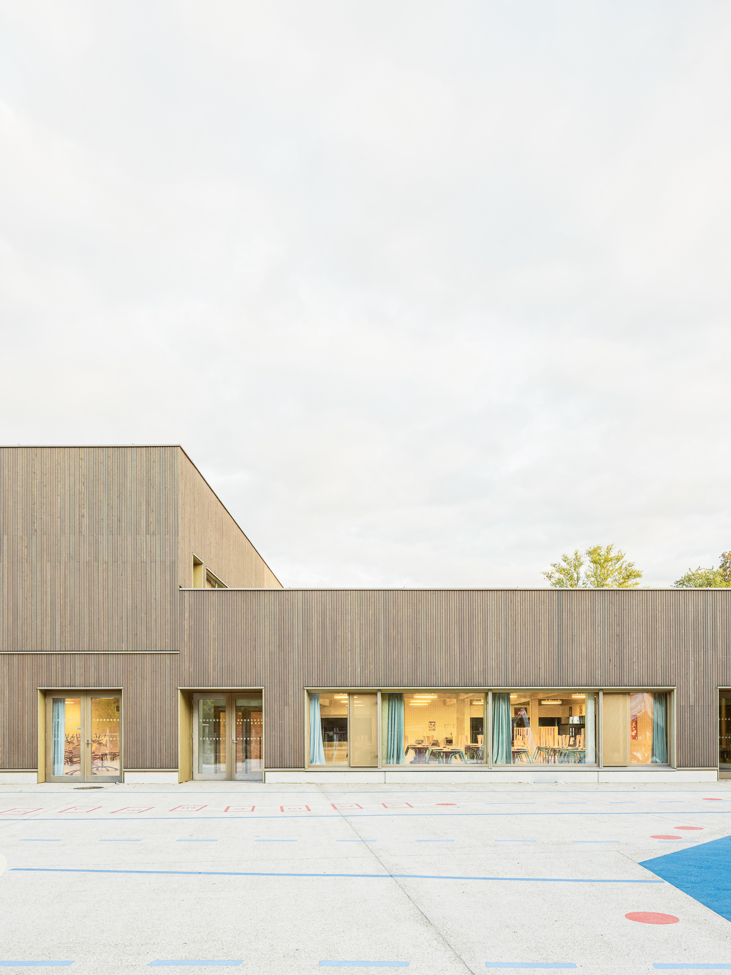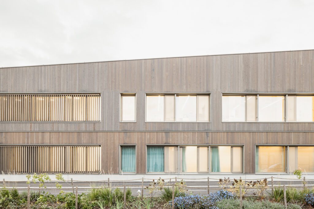 Ouvert sur le quartier, l’équipement met certains de ses locaux (salle de sport et ateliers) à disposition des associations locales. L’attention portée à la qualité de l’air intérieur, à l’acoustique, à la lumière et surtout les belles vues vers le Muhlbach en font un équipement confortable pour les enfants et les équipes.