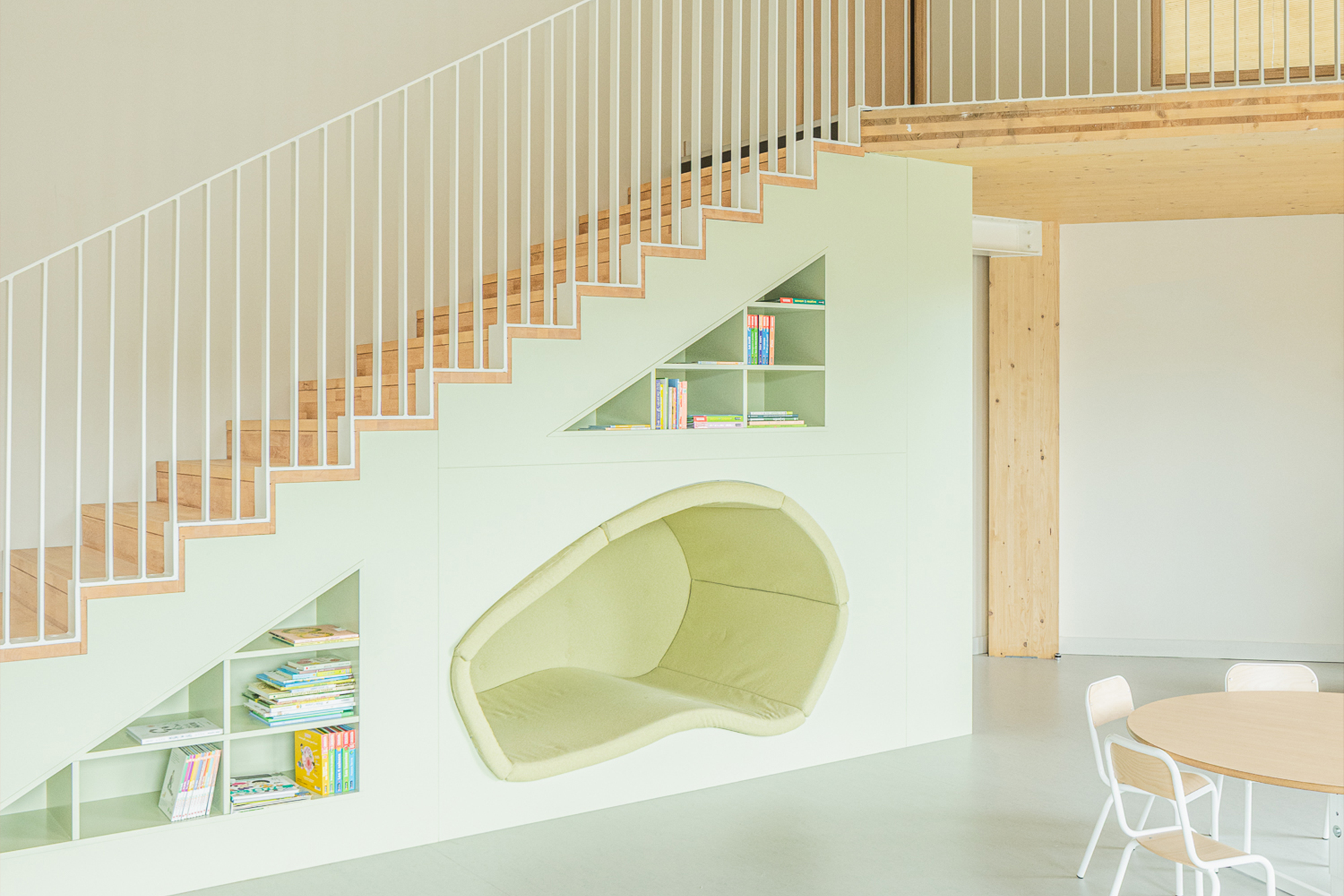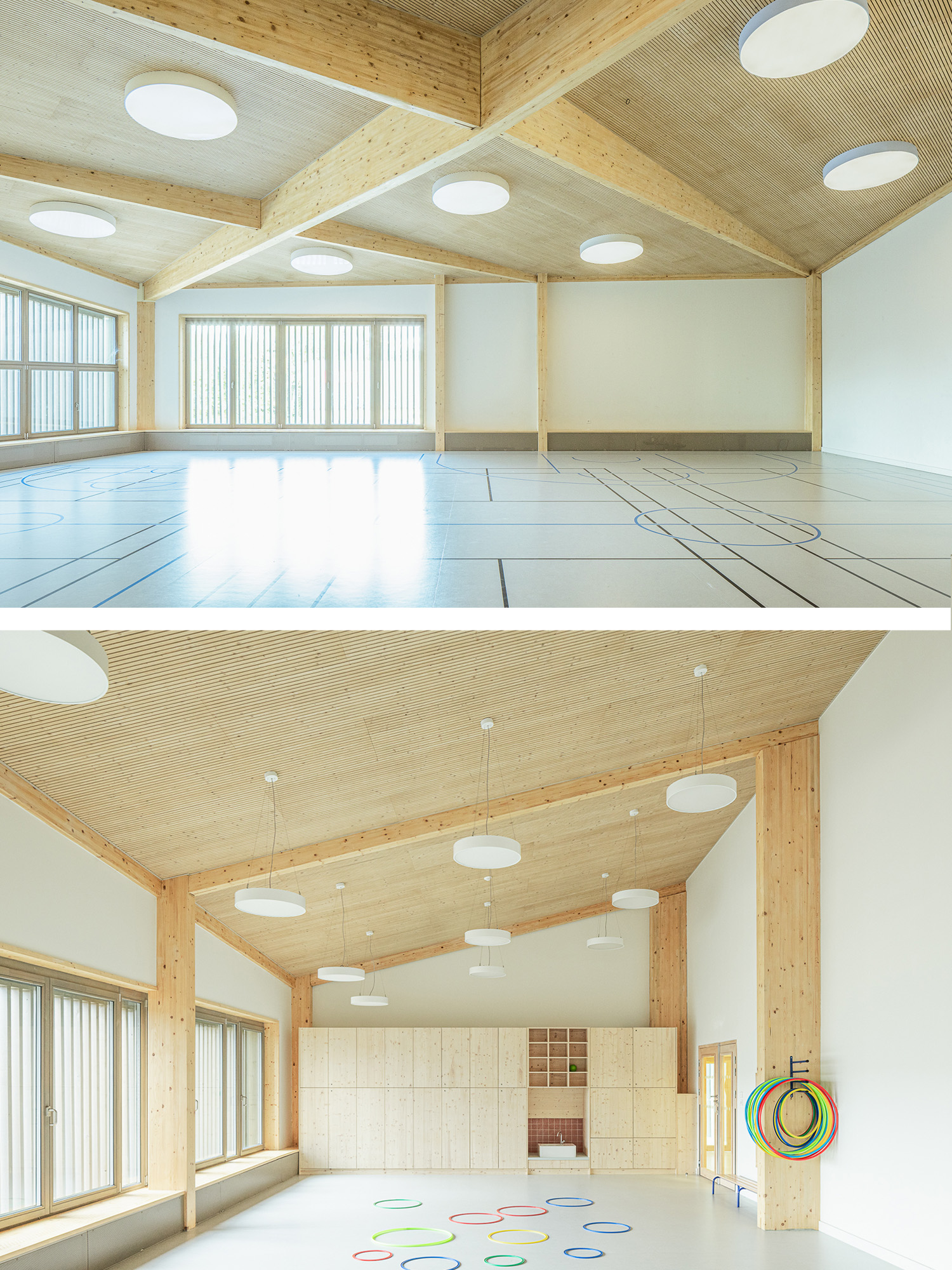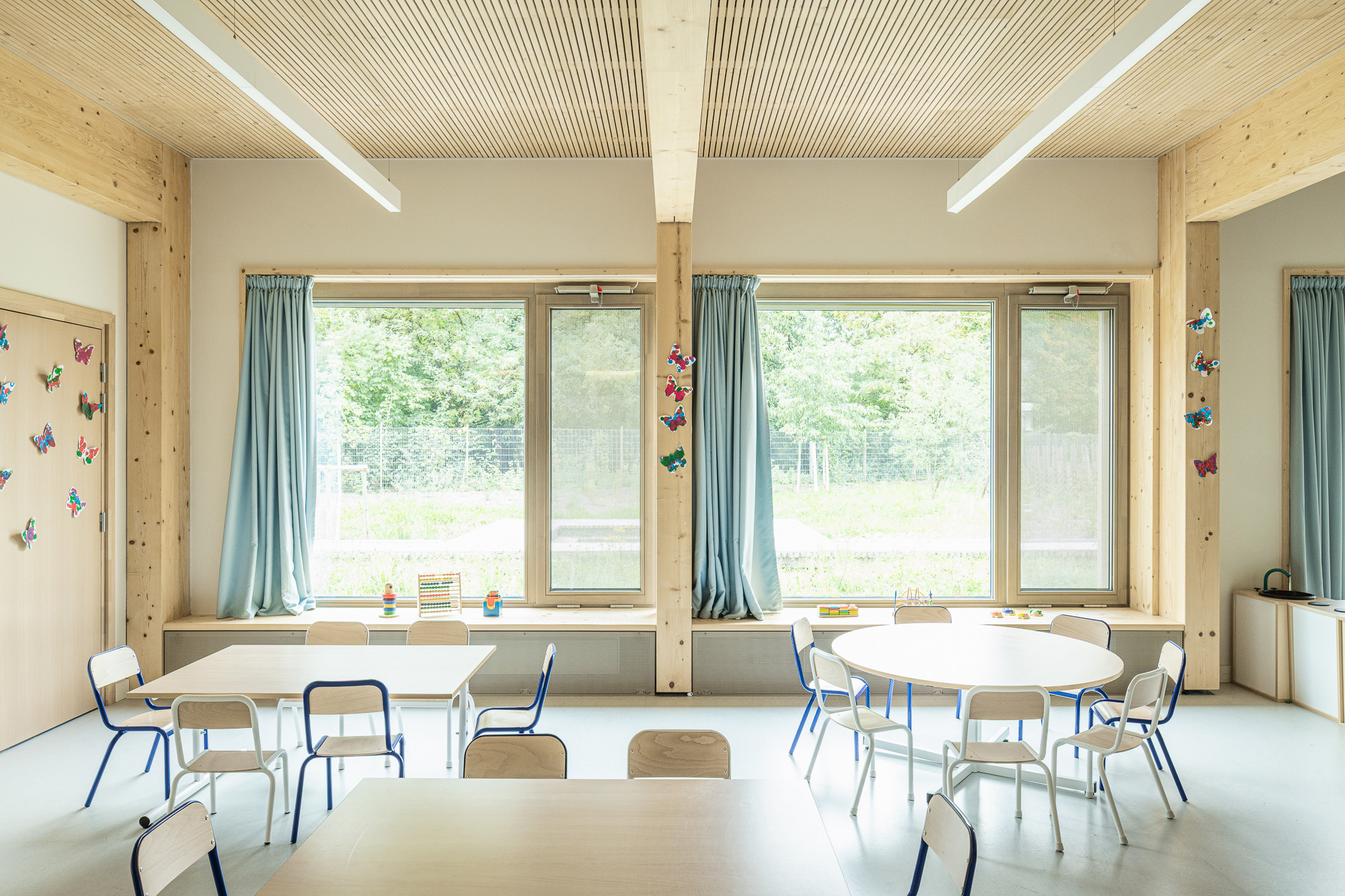 Ouvert sur le quartier, l’équipement met certains de ses locaux (salle de sport et ateliers) à disposition des associations locales. L’attention portée à la qualité de l’air intérieur, à l’acoustique, à la lumière et surtout les belles vues vers le Muhlbach en font un équipement confortable pour les enfants et les équipes.